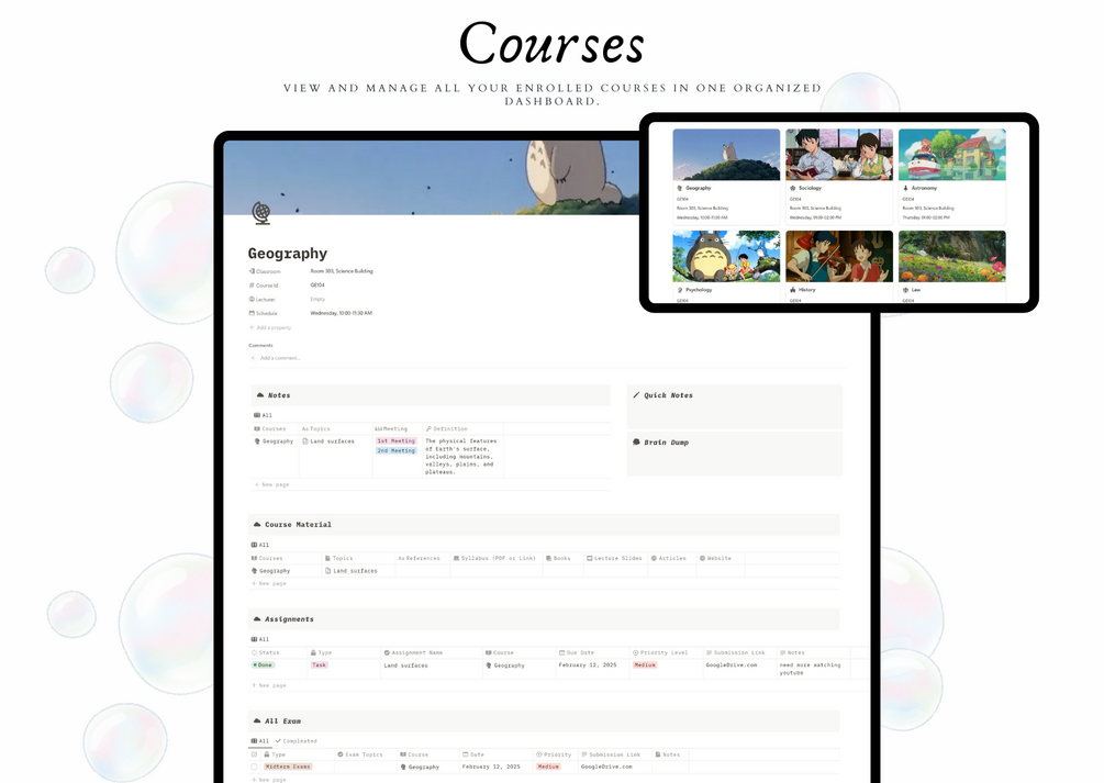 This Notion template includes courses management, notes organization, course materials, assignments tracking, and an exam planner to help you stay organized and productive throughout your academic journey!