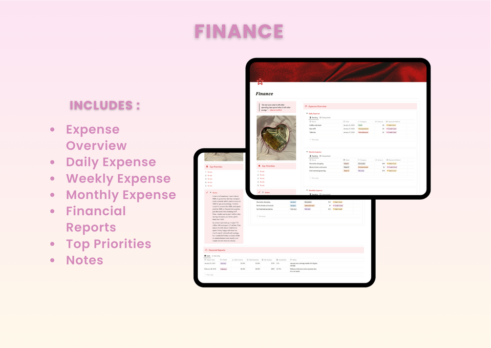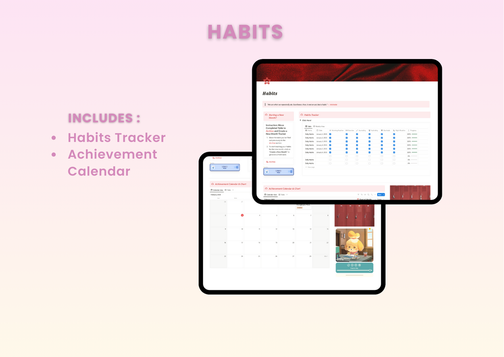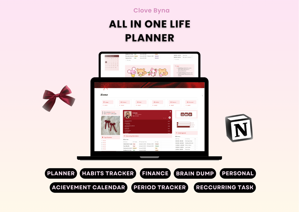 This Notion Includes A planner, task management tools, habit tracking, a finance tracker, personal tools, and much more to help you stay organized and productive in all your activities!